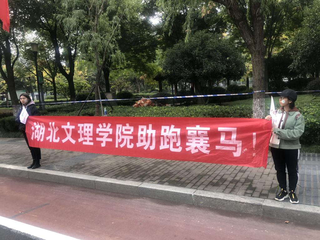 在“襄马”赛道两侧,“湖北文理学院助跑襄马”“到诸葛亮读书的地方上大学”“刻苦读书坚持锻炼”的字样不时出现;在“襄马”赛道上,我校参跑师生或高举大幅校旗或手持小校旗,成了“襄马”赛道上的亮丽风景。