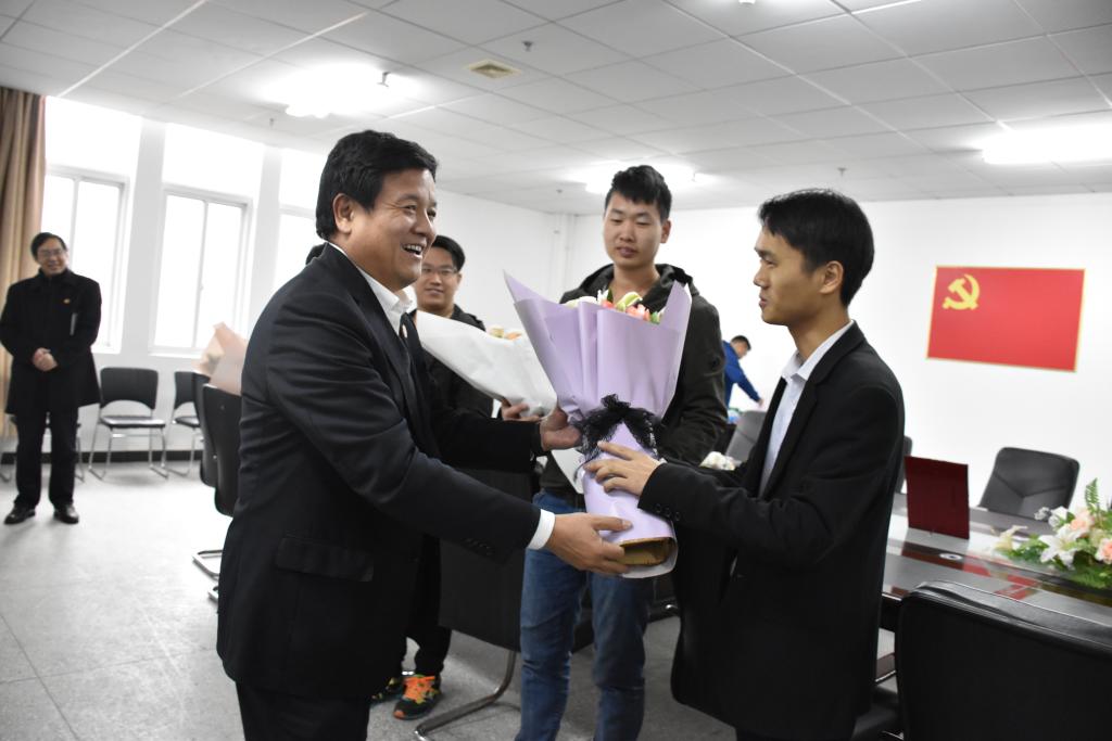 丁世学(左一)向获奖师生献花 卜润慧摄