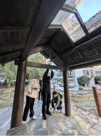 “在水一方”社区现有住户340户,居民1254人,以青壮年为主。社区内多个公共空间节点存在功能优化与品质提升需求。师生团队在社区工作人员引导下,重点考察了入口区域、楼栋间庭院、中心水池、休憩凉亭等四个关键空间。