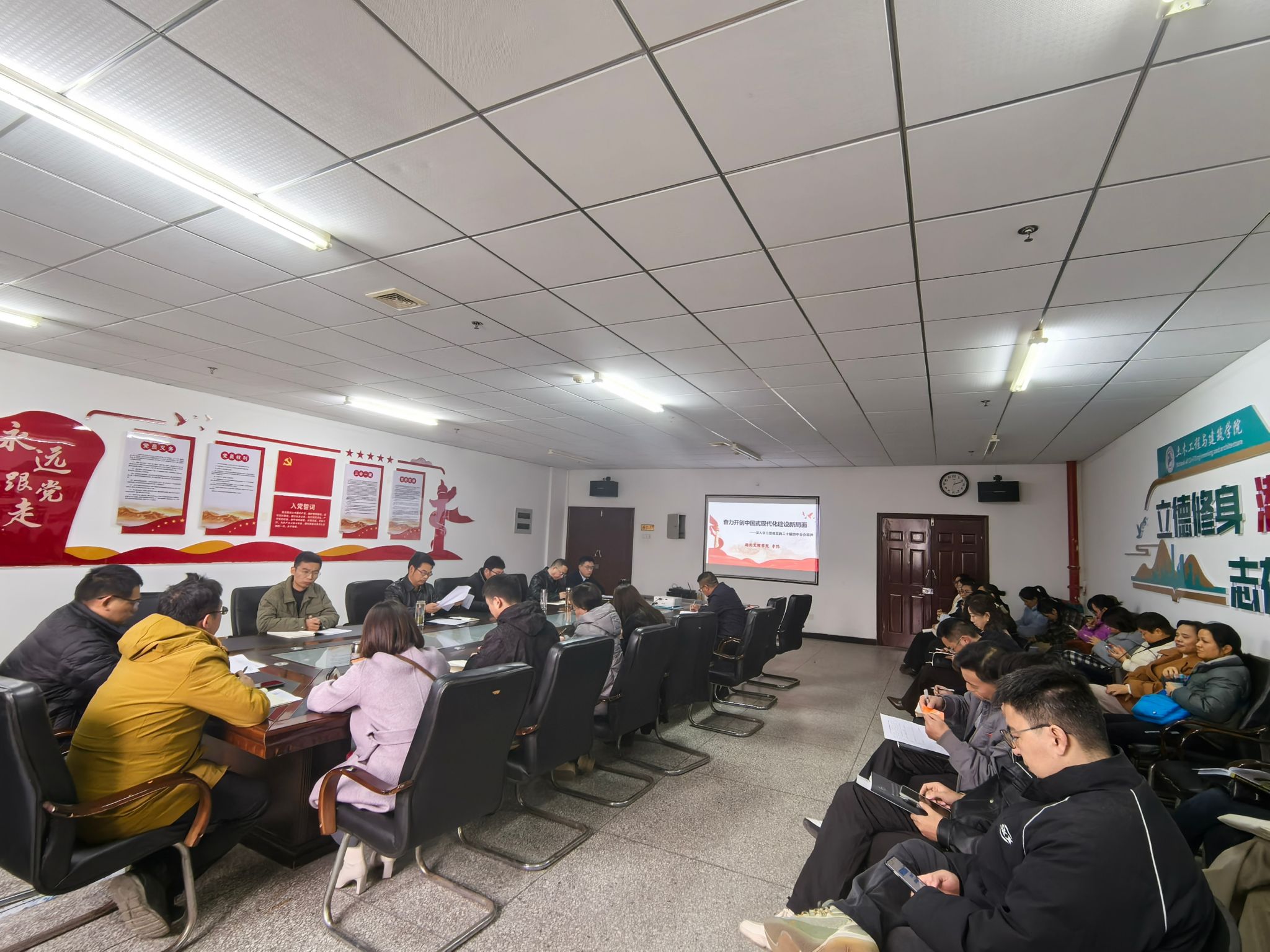 学院党委书记黄海结合宣讲和学习党的二十届四中全会精神要求强调,要深刻领会全会的重大意义、精神实质与实践要求,坚决把思想和行动统一到全会精神上来,坚持不懈用习近平新时代中国特色社会主义思想凝心铸魂,立德树人。要坚持学深悟透、融会贯通、学以致用,把贯彻落实全会精神与科学谋划学院“十五五”规划有机贯通起来,切实把理论学习成果转化为推动学院高质量发展的战略规划、政策路径与实际成效。要切实以更高标准推动学院高质量发展,以更实举措推动建设,以更强担当履行职责,为学校“圆梦创大,逐梦博点”贡献土建学院的智慧与力量。
