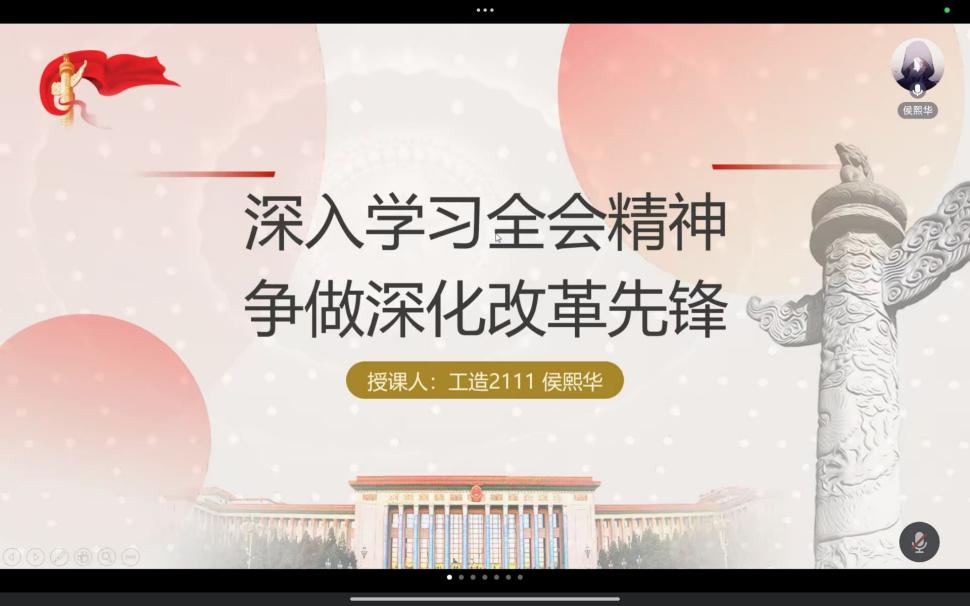 工管系学生党支部侯熙华同志为大家讲党课,用青年视角和青年语言,从明确目标、把握目标任务和以目标为导向逐步取得建设新成果三个方面展开。他说:“党的二十届三中全会是在以中国式现代化全面推进强国建设、民族复兴伟业的关键时期召开的一次十分重要的会议。作为新时代青年,我们要以全会精神为指引,深刻把握进一步全面深化改革的总目标,进一步增强推进改革的责任感使命感紧迫感,全力以赴、久久为功,以实际行动践行‘请党放心,强国有我’的铮铮誓言。”