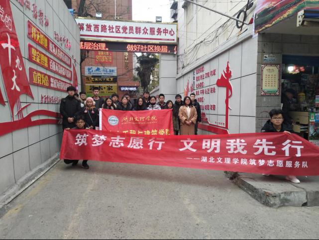 土建学院筑梦志愿服务队积极参与创文宣传活动,进社区、访民情,做义工、送温暖,帮助社区改善了环境,大力弘扬“奉献、友爱、互助、进步”的志愿者精神,为襄阳市全国文明城市创建,做出湖文学子应有的贡献。