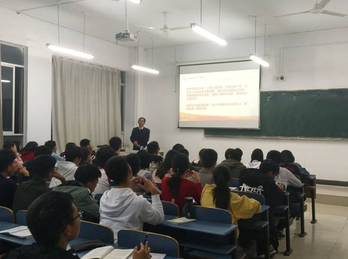 聂教授围绕“学习习近平总书记关于青年成长成才的重要论述”的主题展开讲授。他先用提问的方式带动了课堂的氛围,在谈及青年的价值取向时,他将其总结为四点,即勤学、修德、明辨、笃实。接着他引用习近平总书记的一些重要讲话,意图告诉同学们应主动将个人的奋斗融入国家和民族的奋斗大潮中,将个人的命运与国家和民族的命运紧密相连,同学们对老师的这一观点赞同不已。最后,聂教授强调在学习之余也要注重身体的锻炼,毕竟身体是一切的本钱,并寄语在座的同学,千万不能在该奋斗的时候选择了安逸,要用中国梦去激昂青春梦!