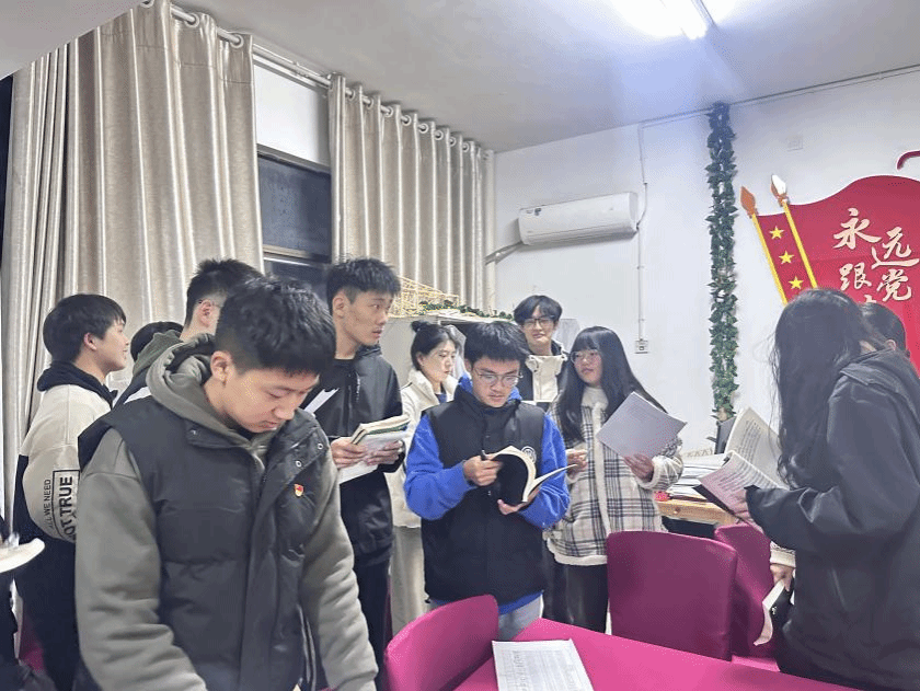 预备党员危劲怡同志带领大家重温入党誓词,并领学《中国共产党章程》,教育引导学生党员们强化党性观念、坚定理想信念,把初心使命化为干事业的自觉行动。