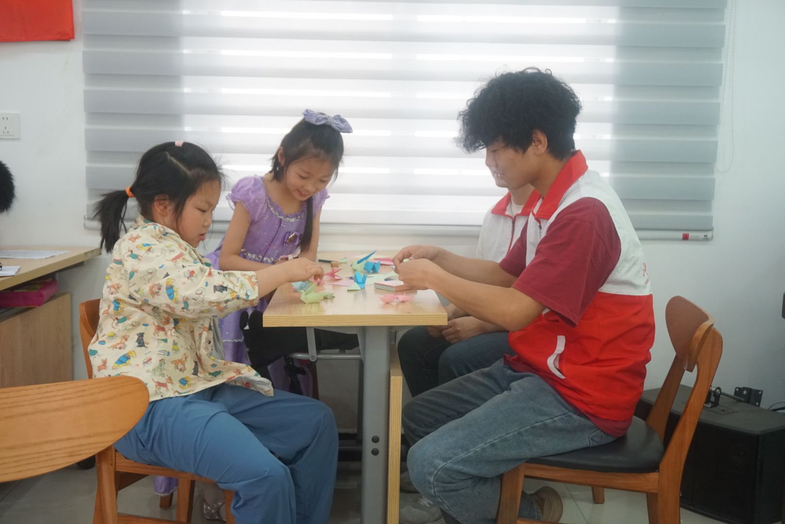 在大学生志愿者的指导下,孩子们动手折起了各式各样的小物品。这堂手工折纸趣味课锻炼了孩子们的动手能力,同时也进一步激发了孩子们的思维想象力与语言表达能力。