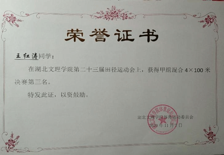 他在努力学习、刻苦钻研的同时,也在学习之余,注重自身德、智、体、美、劳全面的发展,积极充实自己的生活,不断提高自我。他积极参与学校组织的各项活动,多次在学校举办的田径运动会上获得表彰。积极参与篮球新生杯比赛,展现出了大学生的蓬勃朝气。在第二十三届田径运动会上获得甲组混合4x100米决赛第三名的好成绩。